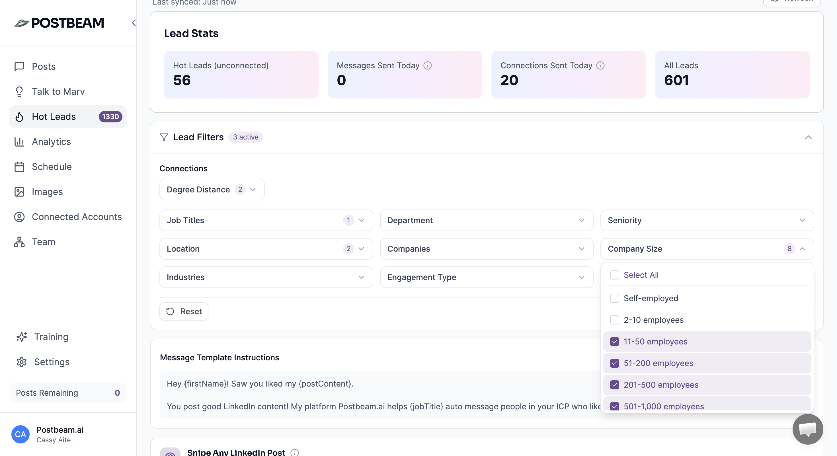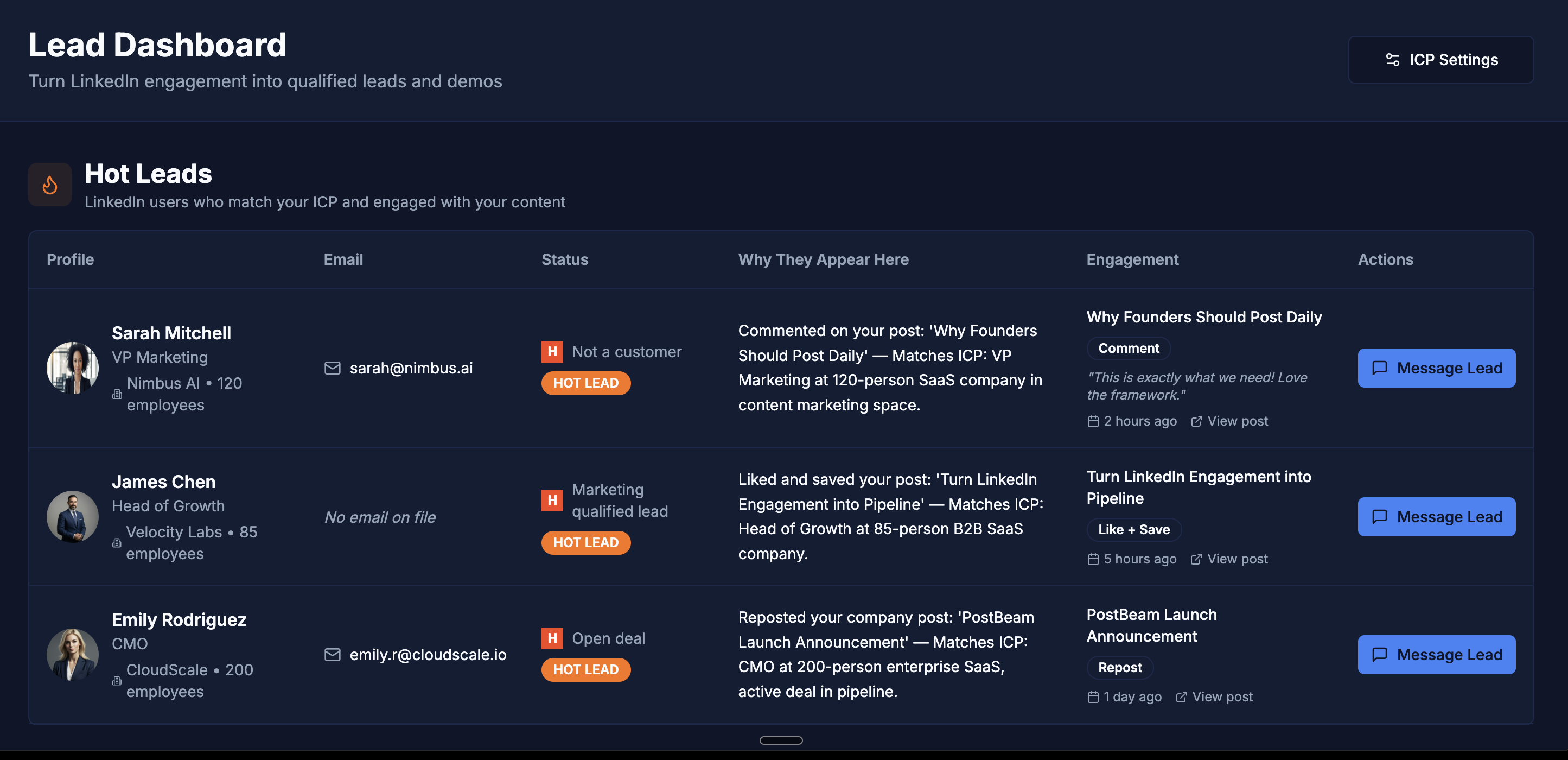 Postbeam surfaces people who like, comment, and view your content. Attention becomes actionable intent while it's warm.