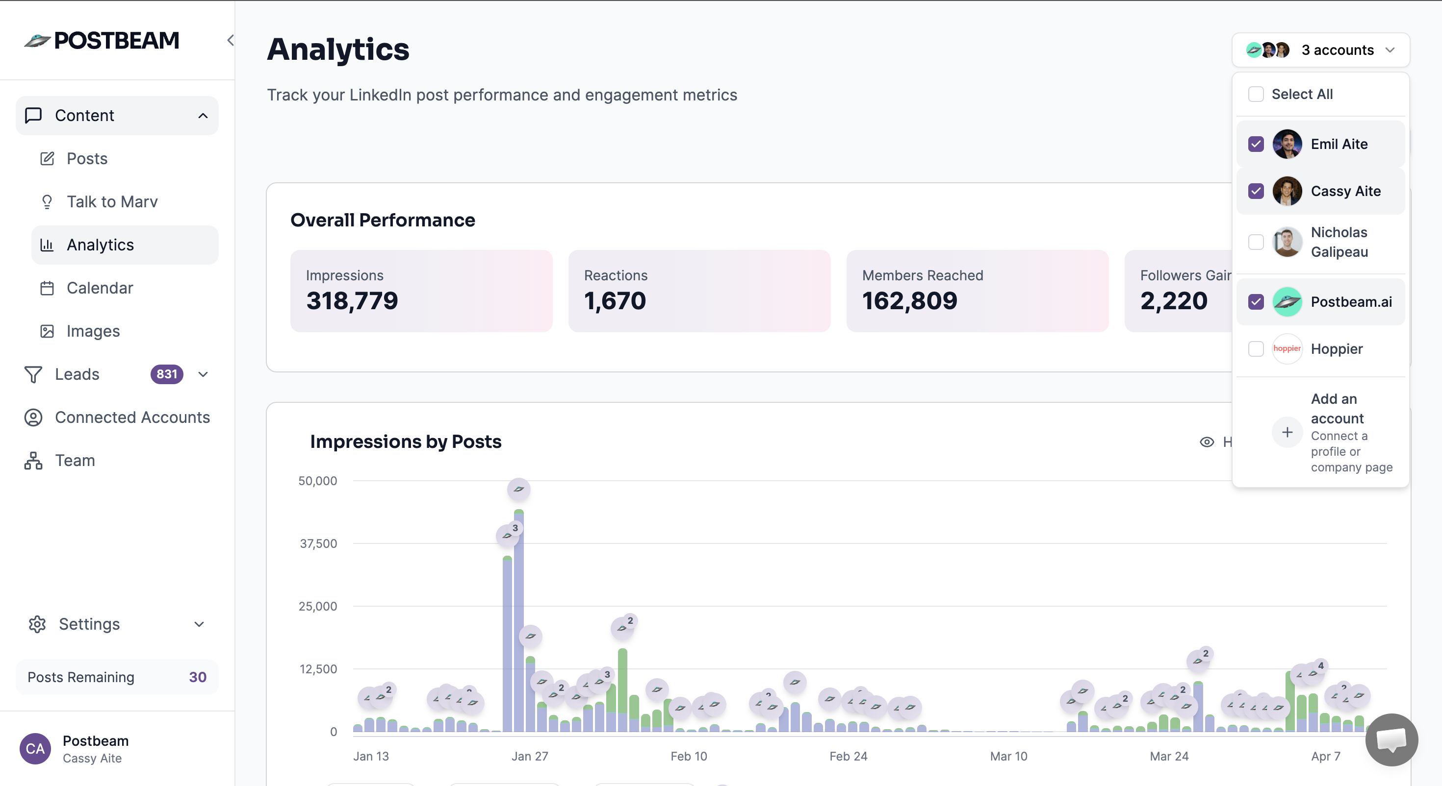 Buffer schedules posts. Postbeam writes them, shows you who engaged, and drafts the first message — for every team member or client.