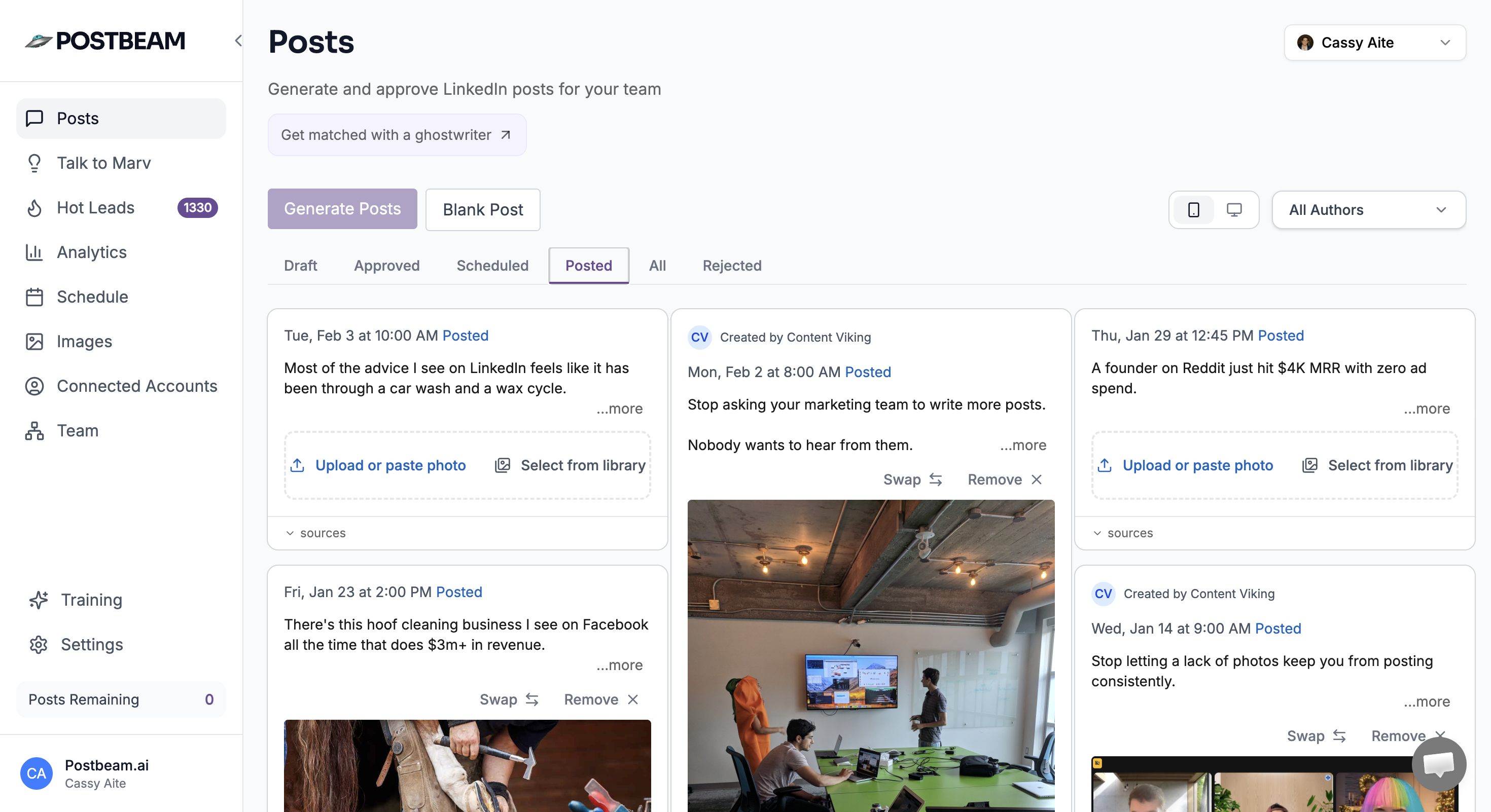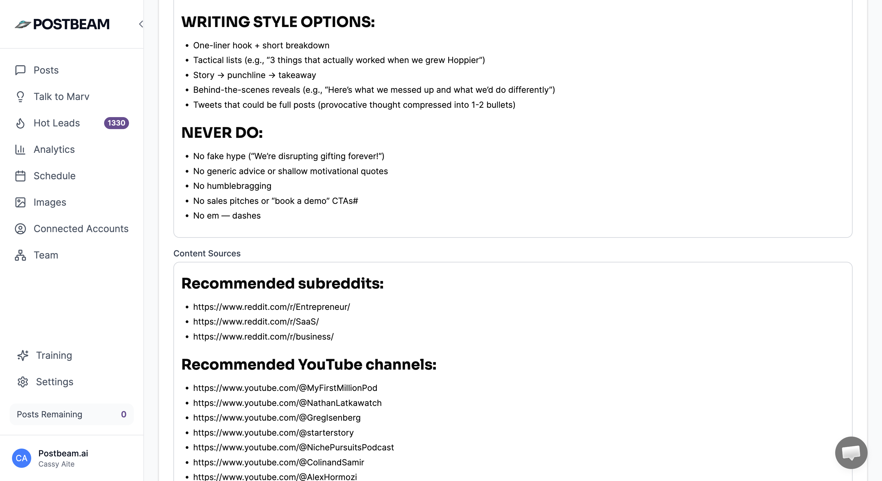 Postbeam learns from your past posts, writing samples, and positioning. No generic AIcontent that sounds like you.